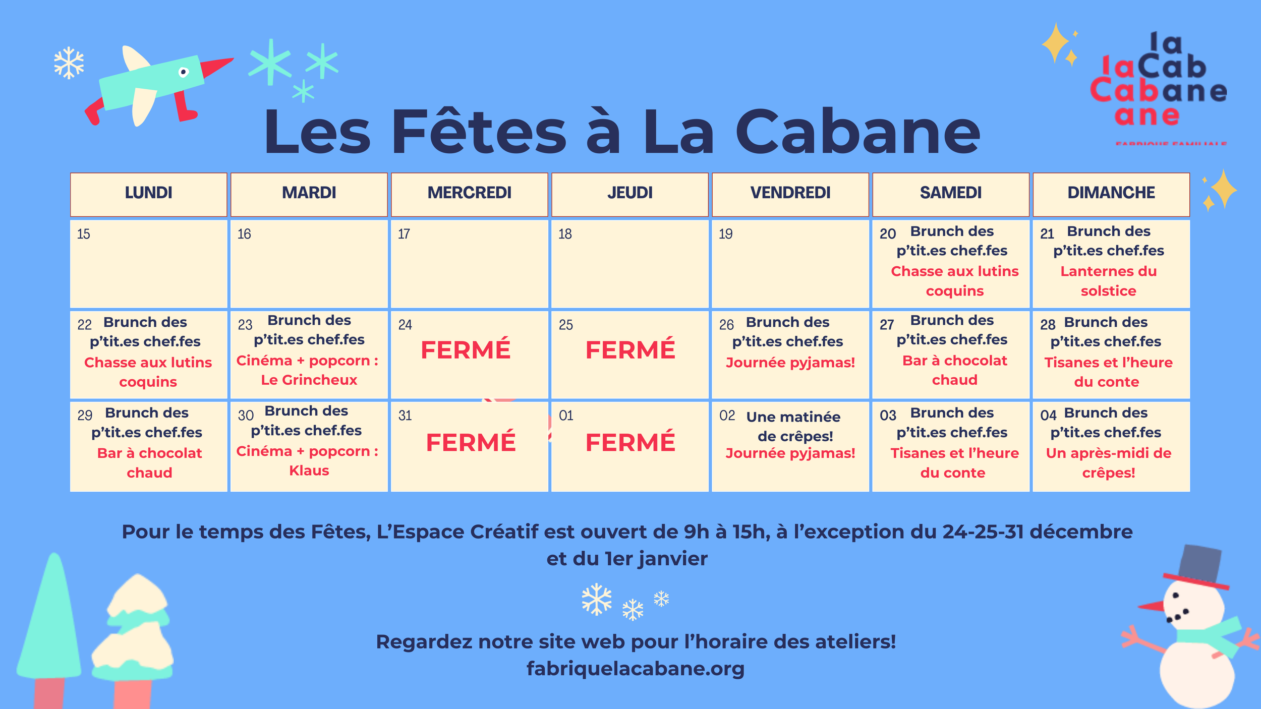 La Cabane est un espace créatif et communautaire intergénérationnel où les familles apprennent en co-créant et en apprenant les unes des autres, ancrées dans les piliers de saines habitudes de vie, créativité et action citoyenne.