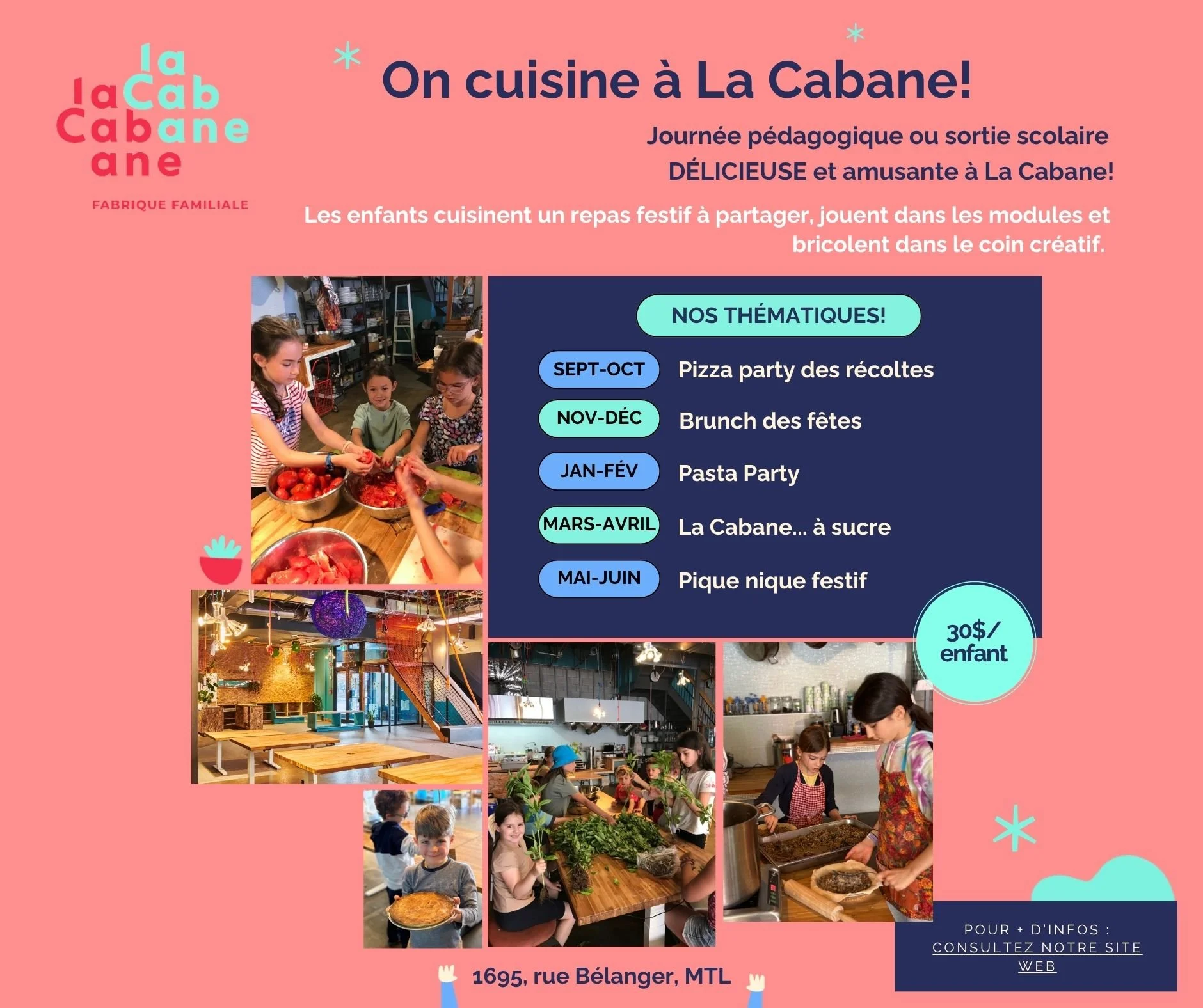 Les enfants auront la chance de cuisiner ensemble un repas thématique, de partager un moment convivial autour de la table et de profiter de nos espaces de jeux intérieurs (glissade, filet pour grimper, petit mur d'escalade) ainsi que de notre coin bricolage pour laisser aller leur créativité.